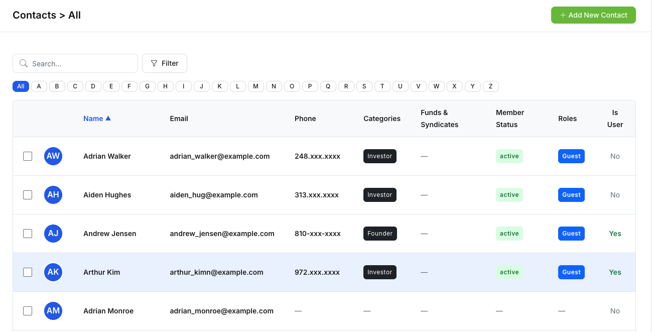 Contacts is the system’s central address book for people and organizations (Investors, Founders, Employees, Admins, Sponsors, etc.). It stores contact details, classification, membership status, and provides a per-contact workspace to view related information such as Data Room / Notes / Portfolios.