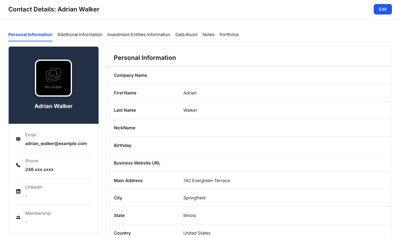 - View contact-related areas: Investment Entities / Data Room / Notes / Portfolios