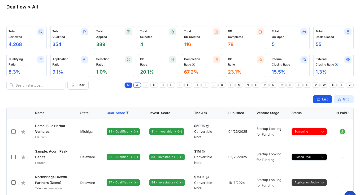 Dealflow is the primary workspace where investors review and track startups available to their organization. It works like a shared pipeline: you can scan key details, prioritize opportunities, update internal statuses, and open a startup profile for deeper review.