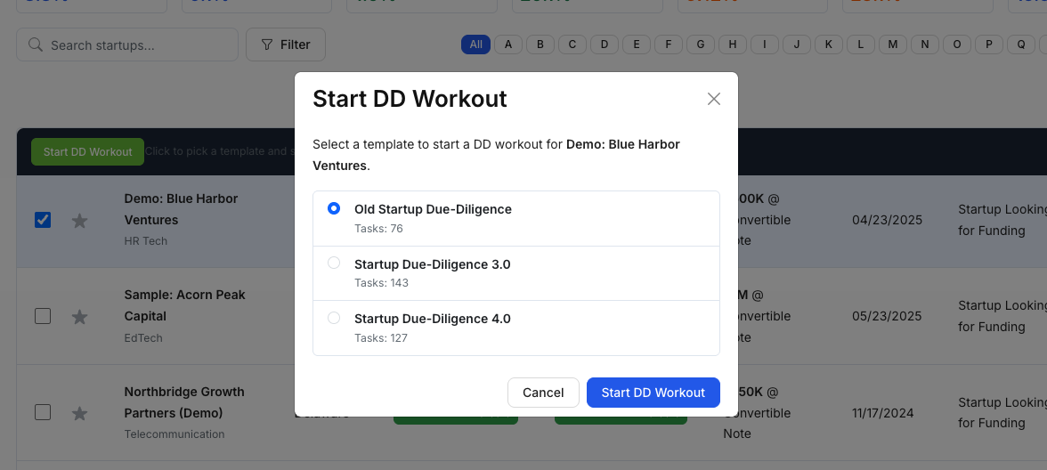 Dealflow is also the starting point for due diligence. When you choose Start DD Workout, SidePitch creates a Due Diligence workspace from a template.