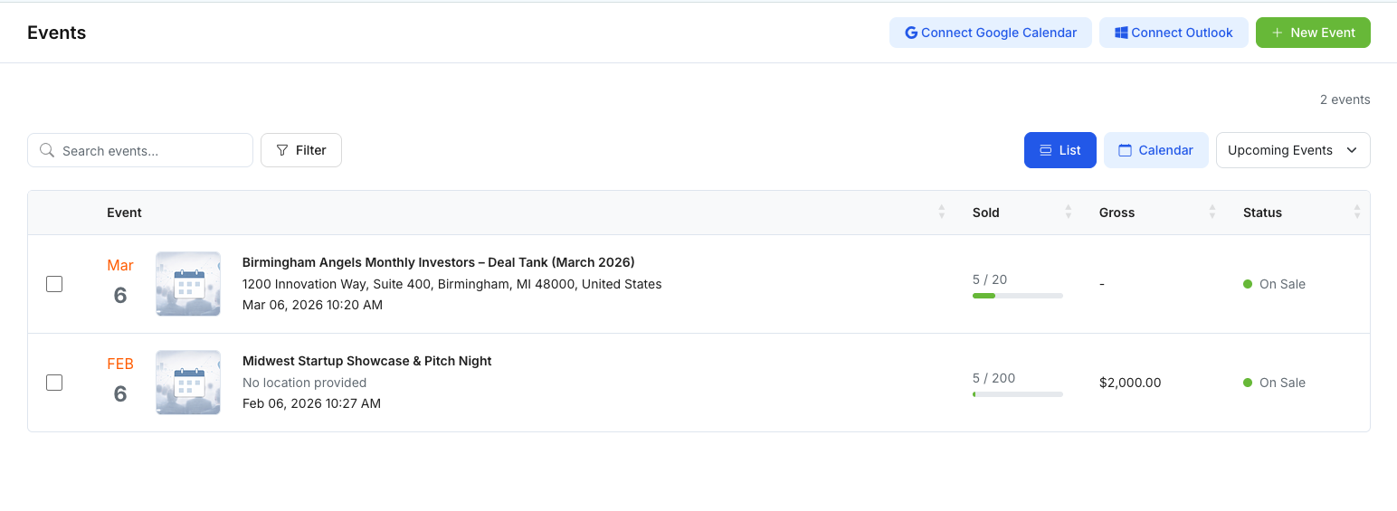 Events is where your organization creates, publishes, and manages investor events (e.g., pitch nights, demo days, office hours, webinars). Events supports both list and calendar views, attendee tracking, optional post-event surveys, and a public event page that attendees can view and register from.
