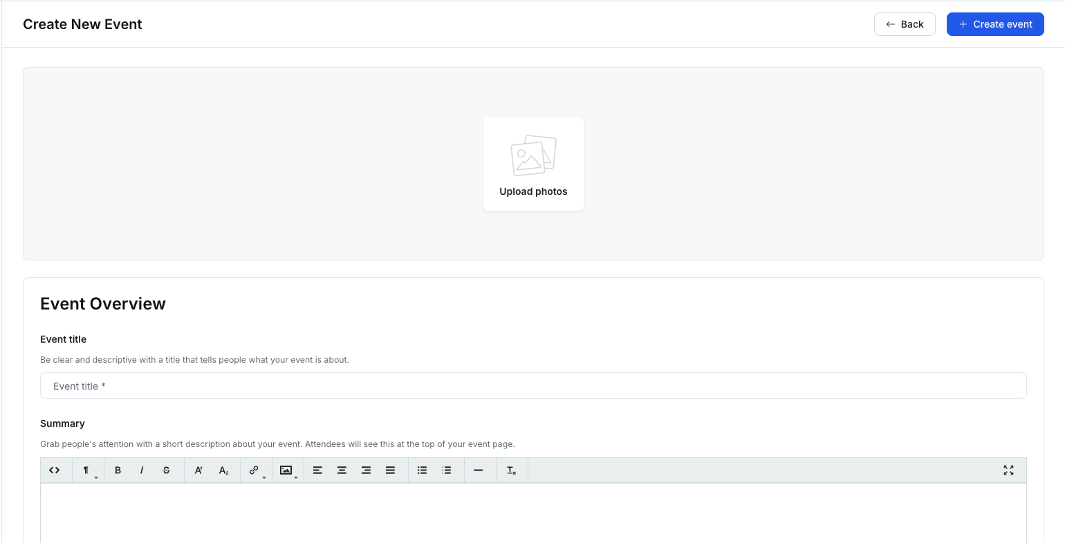 2. Complete event details (title, summary, date & location, optional sections)