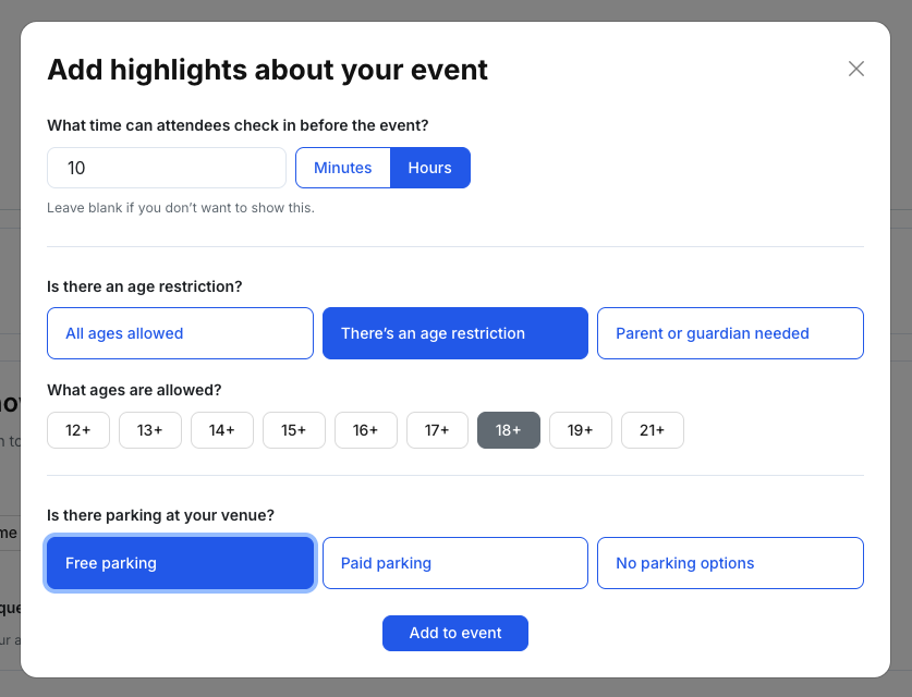 Figure 4 — Add event highlights (door time, age, parking)