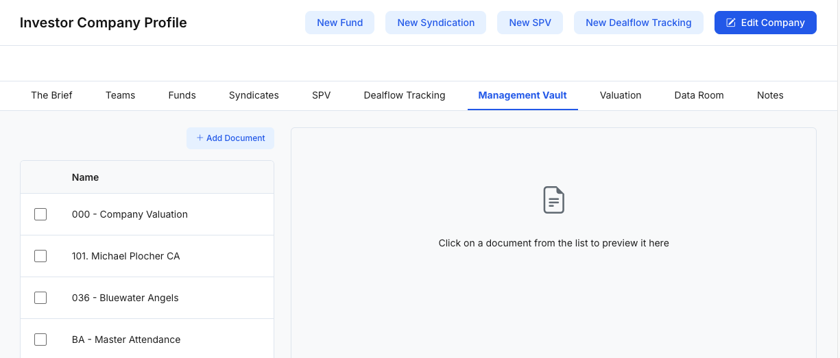 Management Vault is a curated document hub for an investor organization. It provides a lightweight way to store and access key operational resources (e.g., templates, internal playbooks, financial models, partner lists) by saving document links—often to tools like Google Drive/Docs/Sheets.
