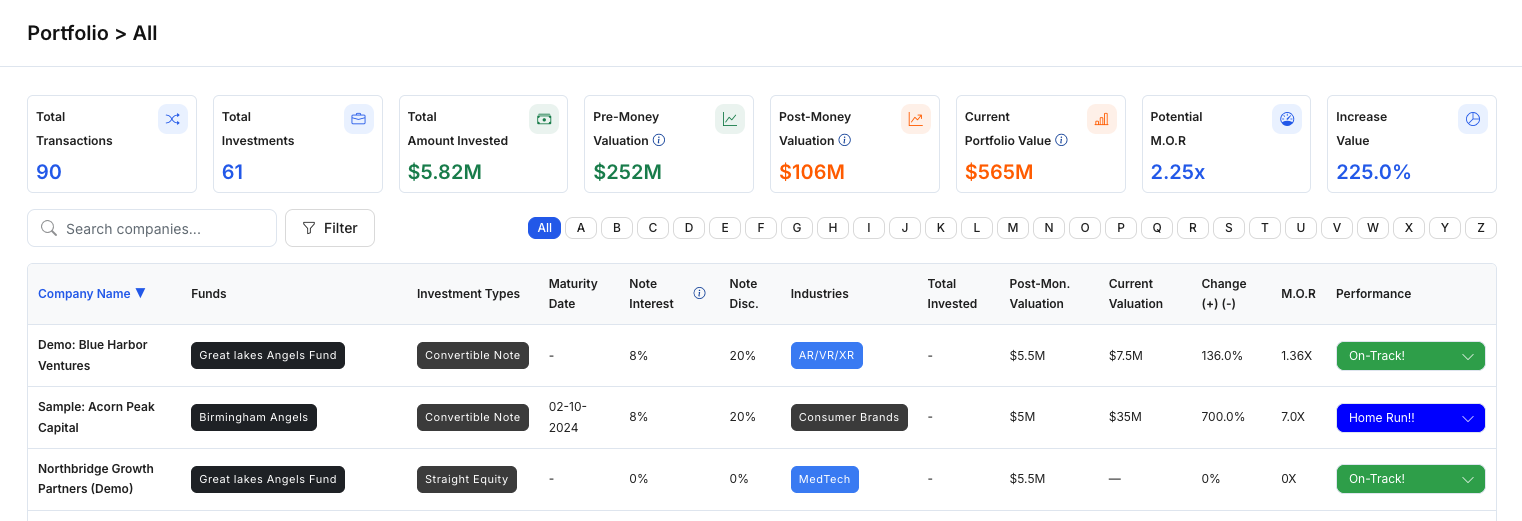 - Track portfolio companies across funds and investment types