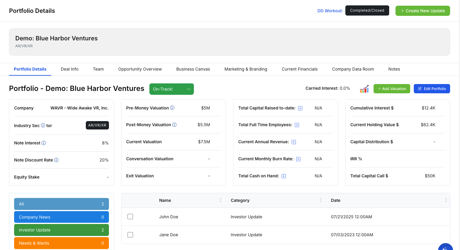 - Open a company’s Portfolio Details to review the current snapshot (valuations + key metrics).