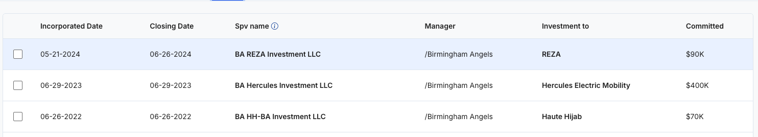 The SPV list provides a quick snapshot of all SPVs under the investor company. Common columns include: