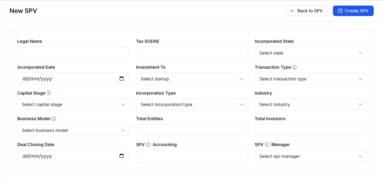 Click New SPV to create a new SPV. The New SPV form typically includes: