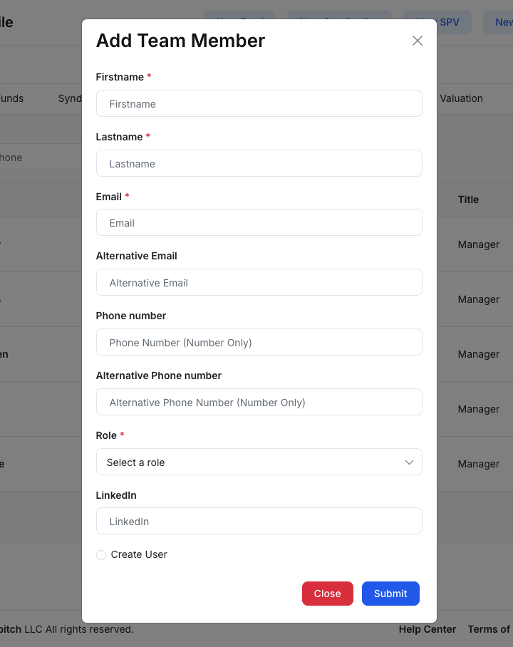 Teams is where your organization manages internal team members who can access and operate within the investor workspace. Use it to keep staff records up to date, assign roles, and maintain contact details in one place.